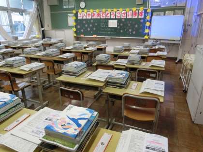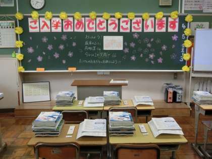 写真は、生徒を待つ1年生の教室の様子です。
