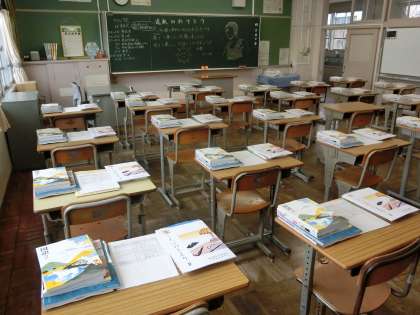 写真は、生徒を待つ2年生の教室の様子です。