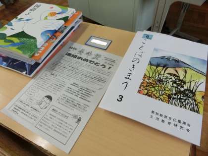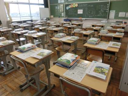 写真は、生徒を待つ3年生の教室の様子です。