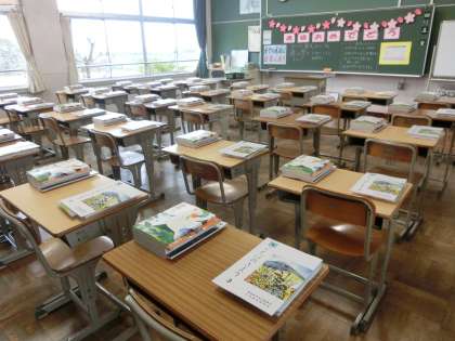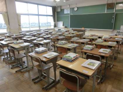 写真は、生徒を待つ3年生の教室の様子です。