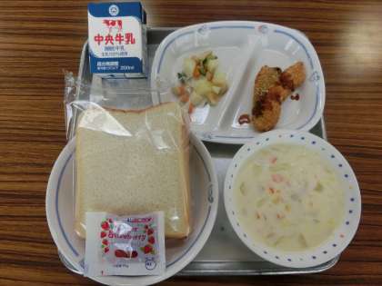 4/17 今日の給食 公開日 2024/04/18 更新日 2024/04/18 特別活動 今日の献立は ————— 春キャベツのポタージュ、たらフライ、ビーンズマセドアン、スライスパン、いちごジャム、牛乳 でした。 *エネルギー:837kcal たんぱく質:31.5g
