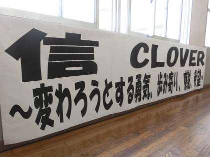 1年生のフロアに掲げられた学年スローガン。
