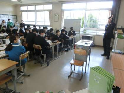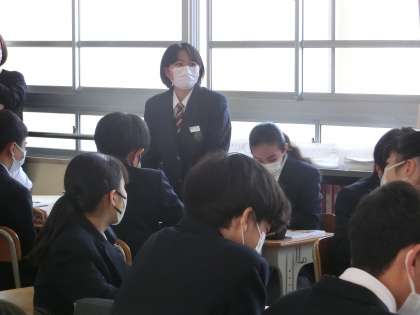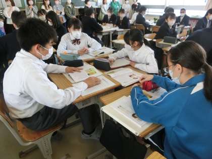 学級担任による道徳の授業で、「挨拶は言葉のスキンシップ」という資料を使って、挨拶の大切さについて考えていました。