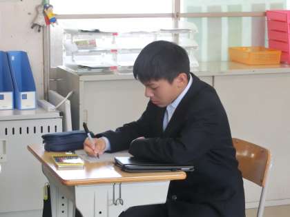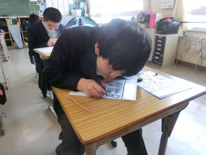 次の時間に控えた「先生インタビューの発表」の準備を終え、各自をアピールする掲示物づくりに取り組んでいました。意欲的に取り組む姿は、1年生のお手本になっています。