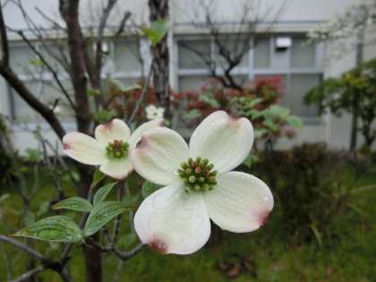 職員室南側に植わるハナミズキ。薄いピンクの花びらの先端には濃いピンク色の部分があり、見ていてとても心が和む花の一つです。花言葉には「永続性」「返礼」「私の想いを受け止めてください」などがあります。中でも「返礼」という花言葉にはこんなエピソードがあります。