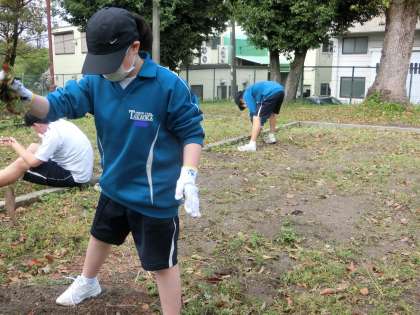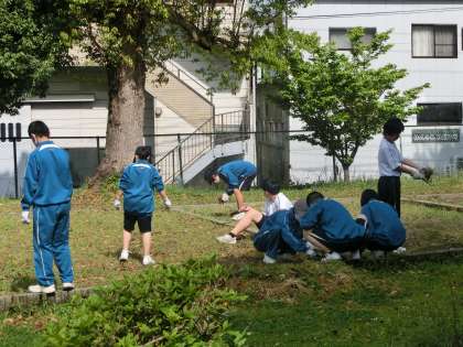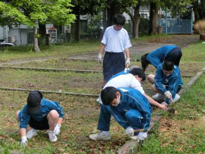 学級菜園の草取りに取り組んでいました。夏と秋の収穫に向け、今年度の学習がスタートしました。