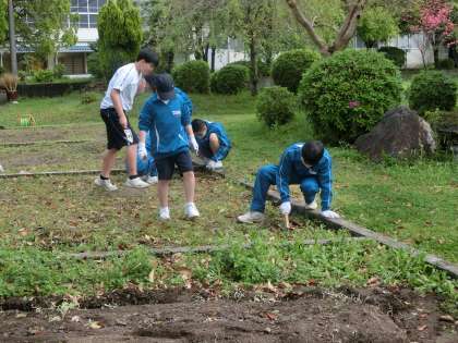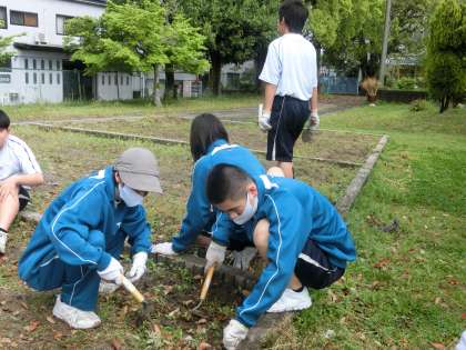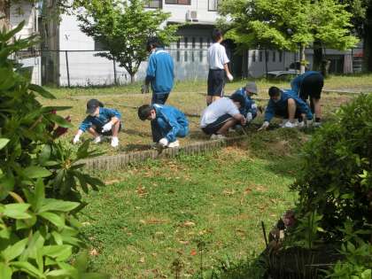 学級菜園の草取りに取り組んでいました。夏と秋の収穫に向け、今年度の学習がスタートしました。