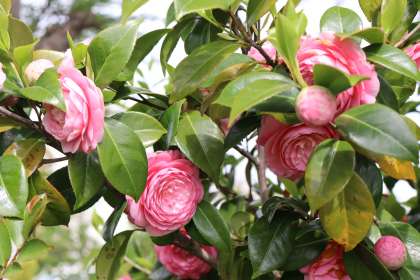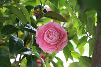正門付近の植え込みに、鮮やかなピンク色のツバキが咲いているのを見つけました。赤や白のツバキは3月頃に見納めとなっているので、楽しみが長く続くのがありがたいですね。来校の際は、一度ご覧になってください。