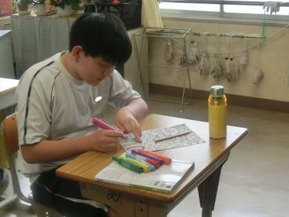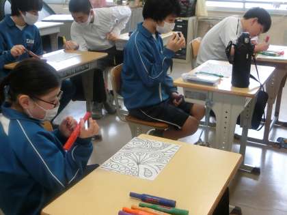 「ゼンタングル」という技法を使ったイラストに、思い思いの色を塗っていました。完成が楽しみです。