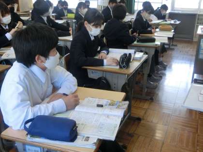 写真は、2年1組の社会・地理分野の授業の様子です。