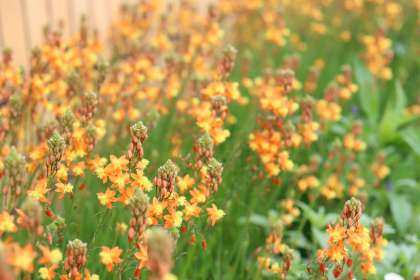 この時期、校内の花壇などでひときわ目を引くのが、「ブルビネ・フルテッセンス(花アロエ)」です。オレンジ色の小さな花がたくさん集まり、とてもにぎやかな感じがします。
