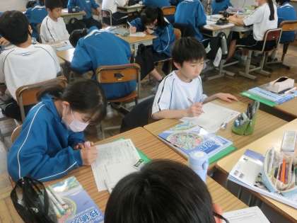 「グリーンカーテンの成功に向けて」と題して、土づくりについて学んでいました。教室での学習のあと、現場での活動が始まりました。