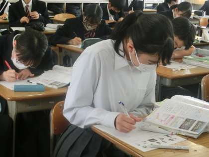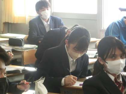 写真は、2年3組の社会・地理分野の授業の様子です。
