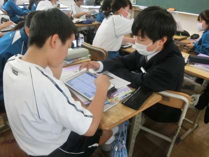 学習用タブレットを使って、興味のある動物のカードの制作に取り組んでいました。