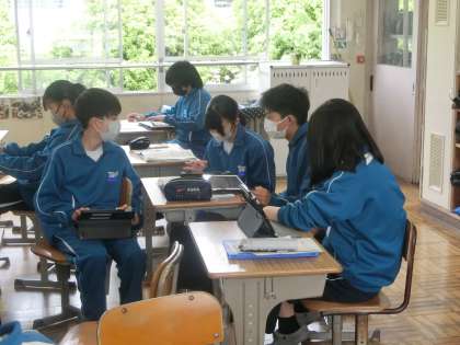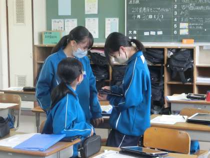 6月に実施予定の職場体験学習に向けて活動する2年生の様子です。体験先への行き方などを調べています。今はまだ仲間の力を借りていますが、少しずつ自分の判断で行動できるよう計画されています。