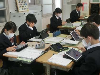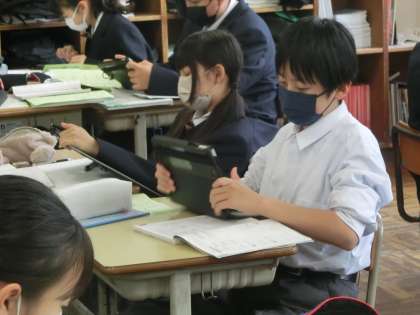 正の数と負の数の計算に取り組んでいました。学習用タブレットも利用して、練習問題にはゲーム感覚で取り組んでいました。