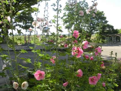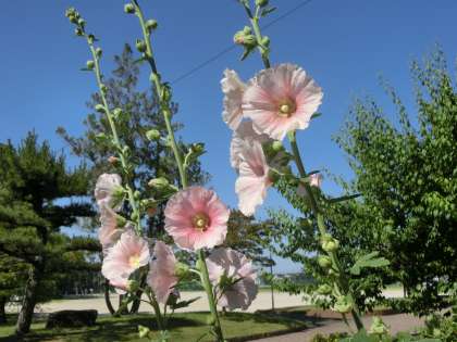 昨日の強風で若干傾いてしまったタチアオイ。きれいに咲いた頃だったので、少し残念な気持ちになります(昨年のこの時期も大雨で同じような状況になってしまいました)。でも、空に向かって伸びる茎と鮮やかなピンクの花は、天気がよいときはやはり見映えがします。何とか復活してほしいと願うばかりです。