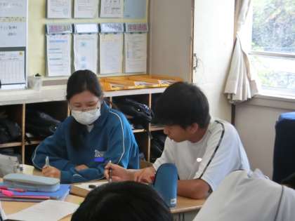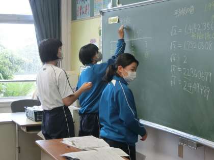 平方根の学びを深めるため、グループの仲間と協力し合って、たくさんの演習問題に取り組んでいました。