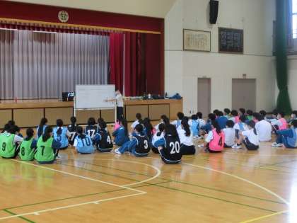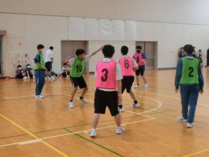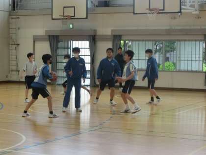 バスケットボールの学習で、前時のパスのみで攻撃を工夫したことを思い出しながら対戦していました。