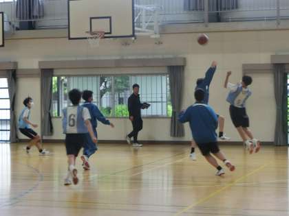 バスケットボールの学習で、前時のパスのみで攻撃を工夫したことを思い出しながら対戦していました。