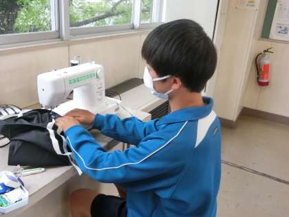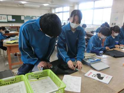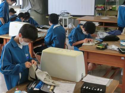 オリジナルエコバッグづくりもいよいよ終盤。仲間と作品の出来について確認し合っていました。