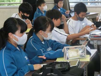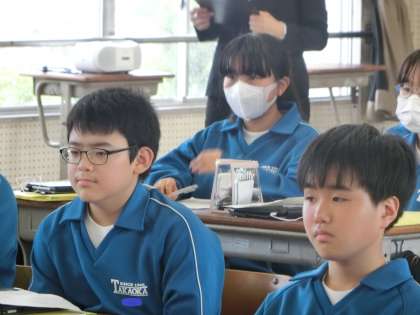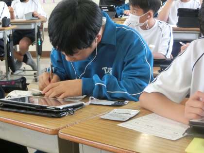 教育実習生による研究授業で、「友達の意見を聞いて、より曲の魅力を感じよう」をテーマに、鑑賞の学習に取り組んでいました。