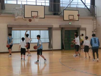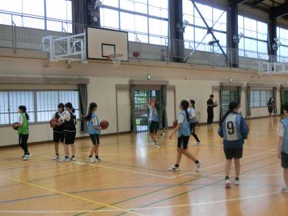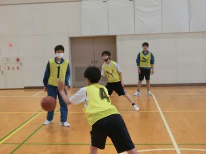 教育実習生によるバスケットボールの研究授業で、「チーム課題の応じて作戦を立て、実践しよう」をテーマに、攻撃のレベルアップを図っていました。