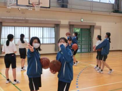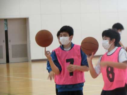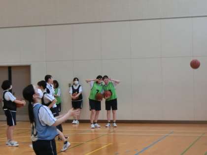 教育実習生によるバスケットボールの研究授業で、「チーム課題の応じて作戦を立て、実践しよう」をテーマに、攻撃のレベルアップを図っていました。