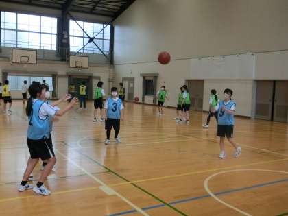 教育実習生によるバスケットボールの研究授業で、「チーム課題の応じて作戦を立て、実践しよう」をテーマに、攻撃のレベルアップを図っていました。