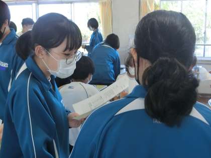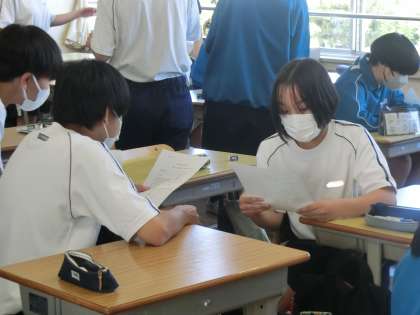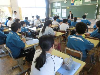 教育実習生による研究授業で、「目指せ! 継続用法マスター!!」をテーマに、現在完了形の文法を身につけるため、ペアでの会話に挑戦していました。