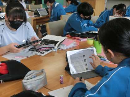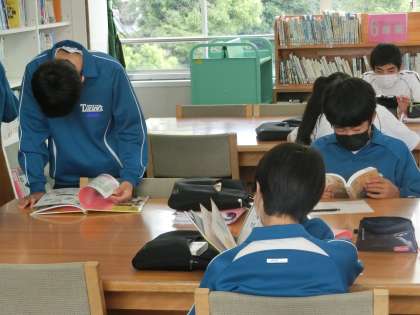 「説得力のある構成で伝えよう」の単元で、「話題について、信頼性の高い情報を集めよう」をテーマに図書室で学習に取り組んでいました。