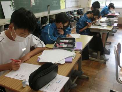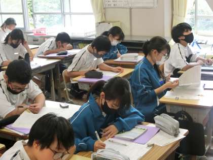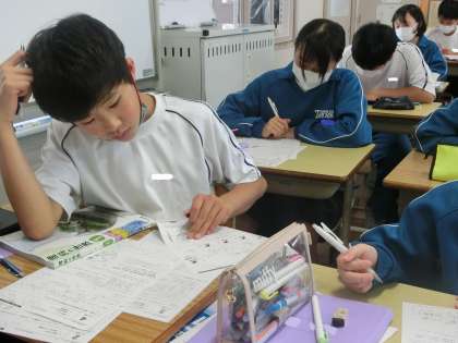 定期テストの出題範囲のまとめのプリントが配付され、今の力を確かめながら取り組んでいました。
