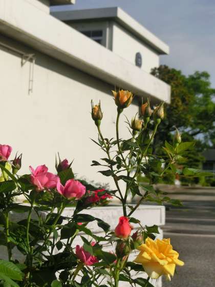 校内の花壇やプランターの花は夏用の種類に植え替えが進んでいますが、玄関のプランターのバラだけは現在もきれいに咲いているため、植え替え(差し替え)られていません。朝日を浴びて鮮やかな色を放つバラに、つい見とれてしまうほどです。