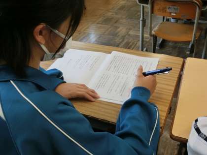 定期テストが返却され、解説を聞きながら解き方の学び直しをしています。