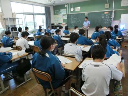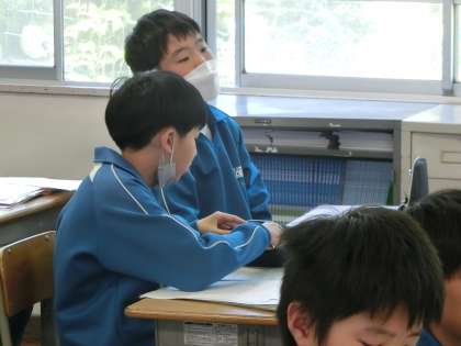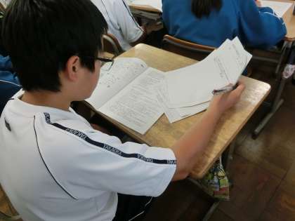 定期テストが返却され、解説を聞きながら解き直しを行っていました。