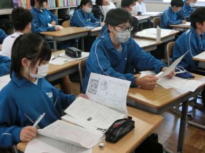 1年4組の社会の授業の様子です。 定期テストが返却され、解説を聞きながら解き直しを行っていました。