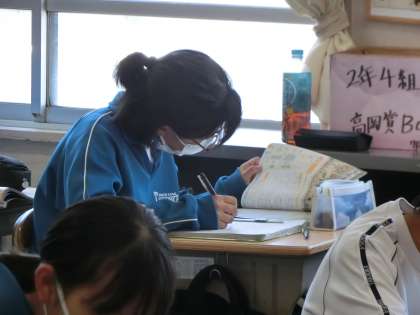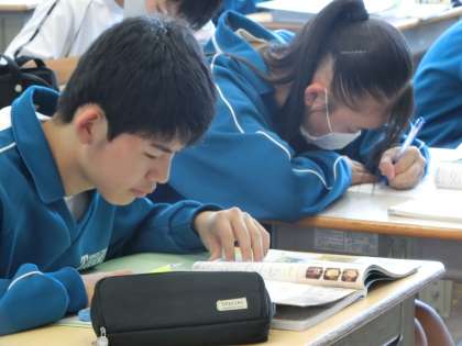 定期テストが返却され、教科書やノートを見ながら、これまでの授業を思い出しながら、各自で解き直しに取り組んでいました。
