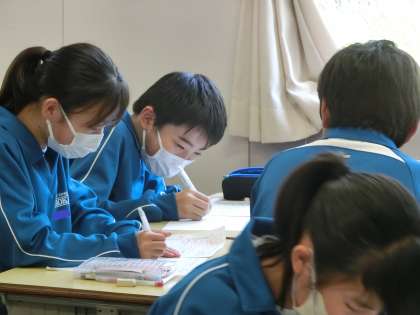 定期テストが返却され、解説が行われたあと、理解が不十分だったところの解き直しや仲間への説明で知識の定着を図っていました。