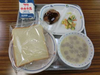 6/7 今日の給食 公開日 2024/06/07 更新日 2024/06/07 特別活動 今日の献立は ————— 豆豆豆のスープ、ハンバーグサンド(スライスパン)、アーモンドサラダ、牛乳 でした。 *エネルギー:826kcal たんぱく質:31.6g