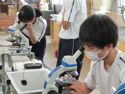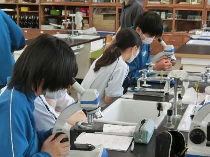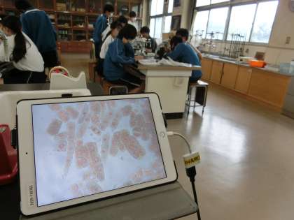 「細胞分裂のときに核に起こる変化を観察しよう」をテーマに、顕微鏡を使った観察の学習が行われていました。