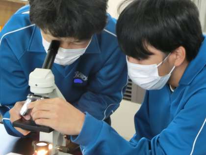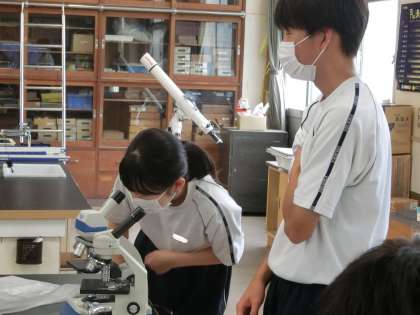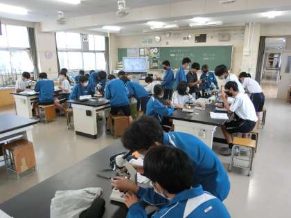「細胞分裂のときに核に起こる変化を観察しよう」をテーマに、顕微鏡を使った観察の学習が行われていました。