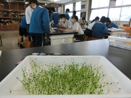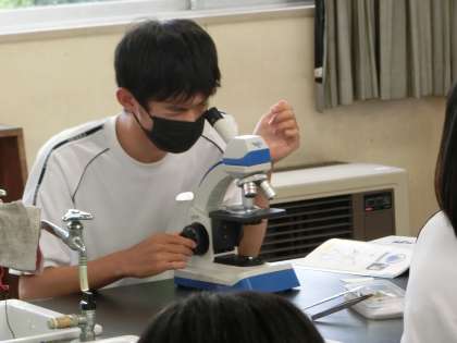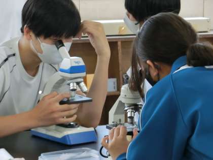 「細胞分裂のときに核に起こる変化を観察しよう」をテーマに、顕微鏡を使った観察の学習が行われていました。