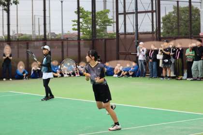写真は、柳川瀬公園テニスコートで行われたソフトテニス部・団体の大会の様子です。