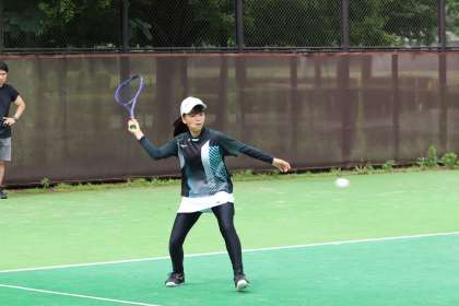 写真は、柳川瀬公園テニスコートで行われたソフトテニス部・団体の大会の様子です。