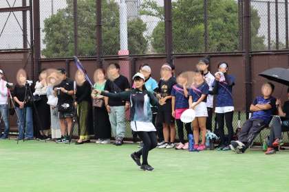 写真は、柳川瀬公園テニスコートで行われたソフトテニス部・団体の大会の様子です。