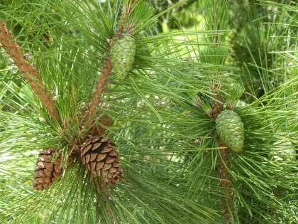 校地の巨大化した松の木で、松ぼっくりがグングン成長しています。イメージとは少し違う緑色のものが、次第に焦げ茶色に変化し、かさが開いてイメージどおりのものになります。