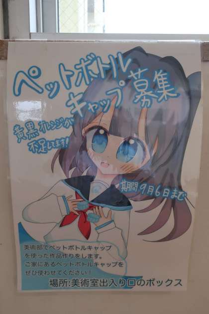 秋の文化祭に向け、早くも美術部の生徒たちが動き始めています。今年度は、ペットボトルキャップを使っての作品づくりに取り組みます。ただ、作品を完成させるための指定の色のキャップが不足していることもあり、ポスターを作って全校生徒に協力を依頼しています。