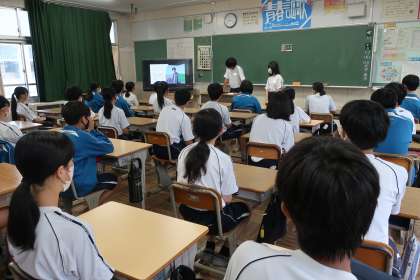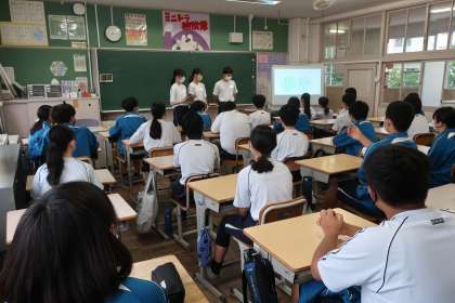 朝の活動時、3年生が2年生の教室を訪れ、「修学旅行・企業訪問発表会」を行いました。問題意識や目的をもって企業を訪問することで、たくさんの気づきや学びがあることが伝えられていました。また、その後の生活や将来の自分にとって大変有効な機会であることも伝えられていました。