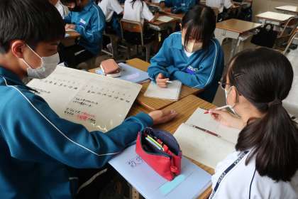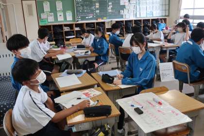 一次関数の学習で、法則を見つけながら式に表す方法を話し合いを通して学んでいました。
