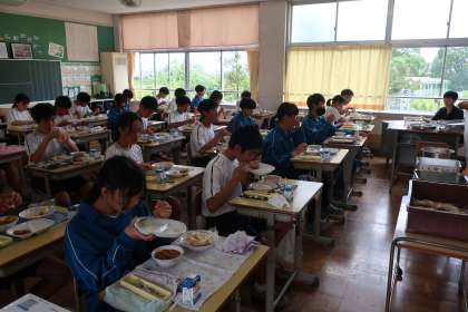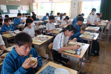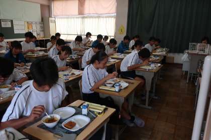 夏休み前最後の給食を食べる3年生の様子です。
